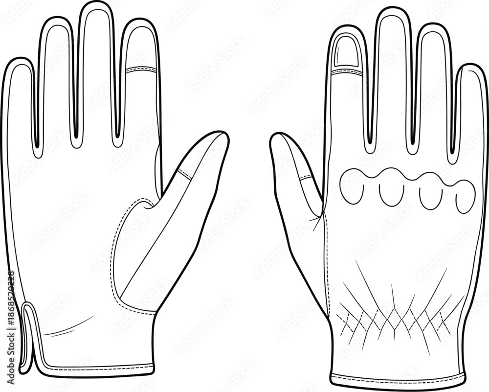 Glove design, palm view, back view, technical drawing, fashion sketch, stitching detail, vector outline, handwear, flat vector illustration #1868520228