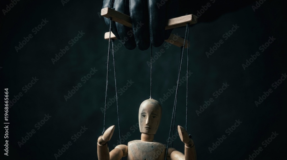 Gloved hand controlling wooden puppet with strings. Concept of manipulation, influence and control. Metaphor for social or political power, decision making and lack of free will. #1968665664