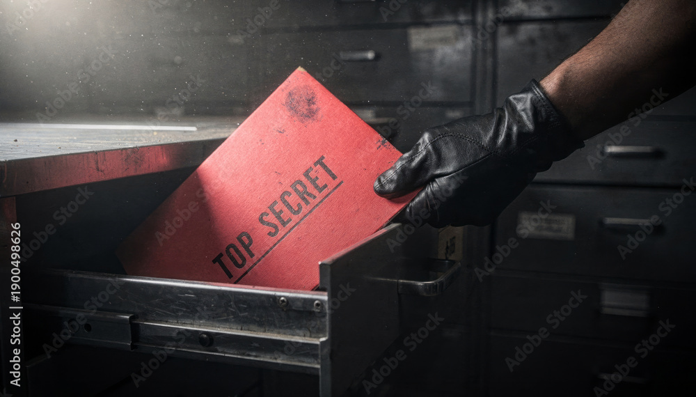 Gloved hand takes top secret file from drawer. Suspenseful espionage mystery with confidential document in dark room #1900498626