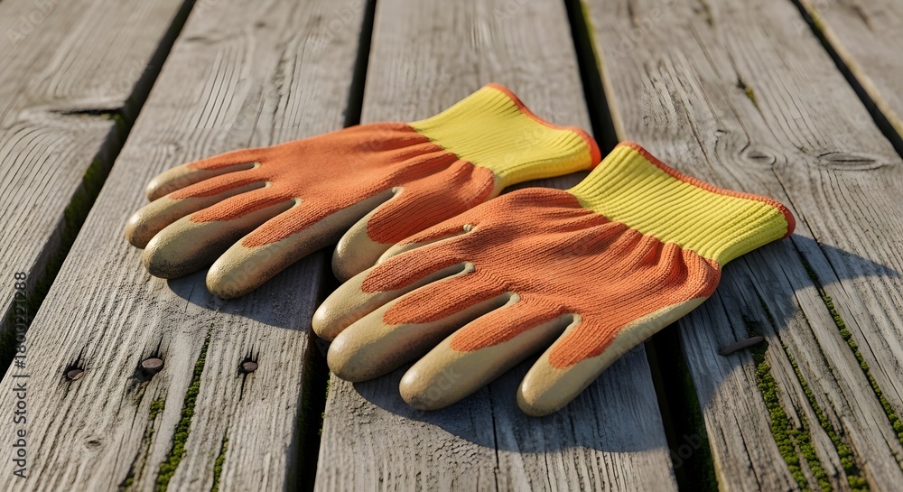 Gloves Resting on a Wooden Plank: A pair of vibrant work gloves, their colors contrasting beautifully against the rustic texture of a weathered wooden plank, suggesting labor or outdoor activity. #1800221288