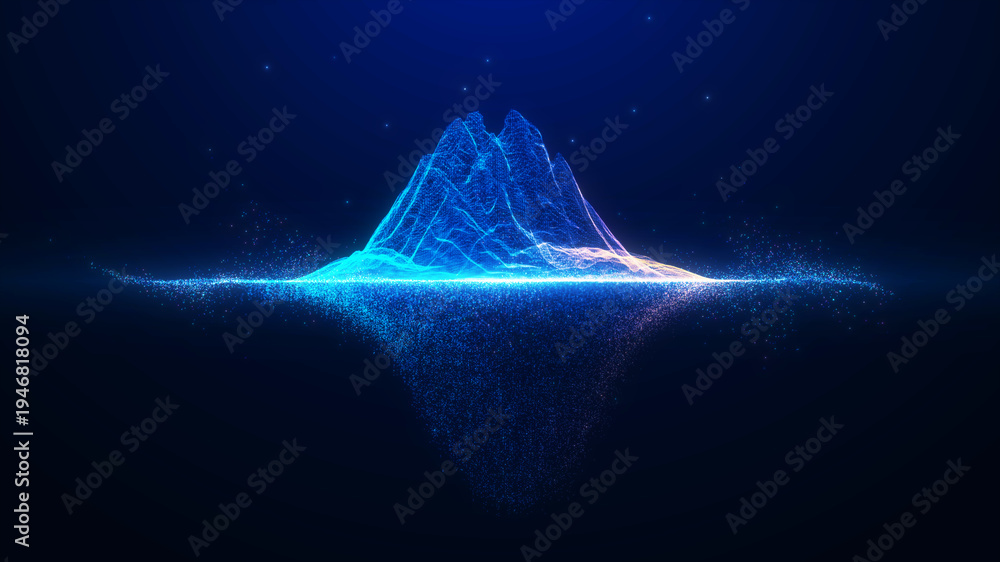 Glowing blue digital iceberg made of particles and wireframe mesh representing big data artificial intelligence and deep web concepts on a dark background #1946818094