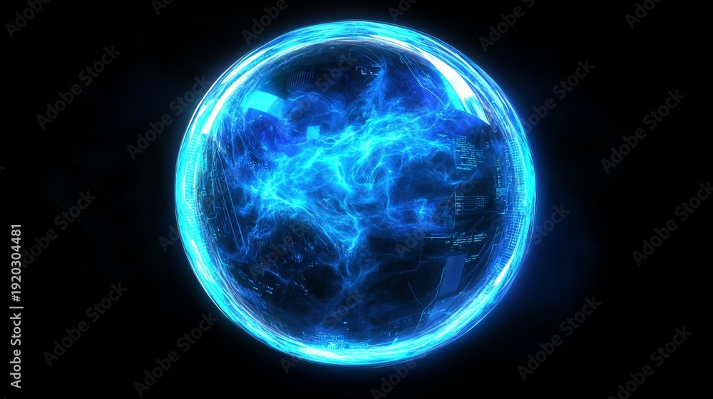 Glowing blue energy sphere with electric patterns in dark space #1920304481