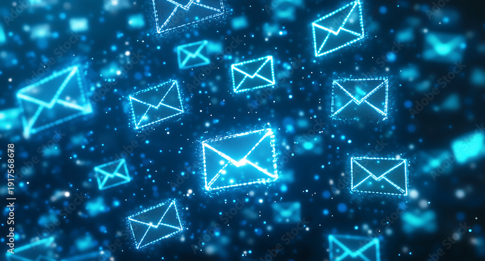 Glowing blue envelopes floating in a digital space representing email communication. #1917568678