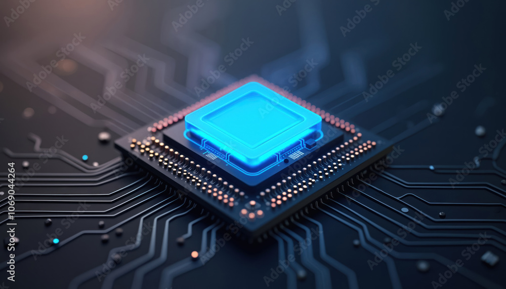 Glowing Blue Processor on Circuit Board: A close-up of a glowing blue processor on a circuit board, representing high-performance computing technology. #1069044264