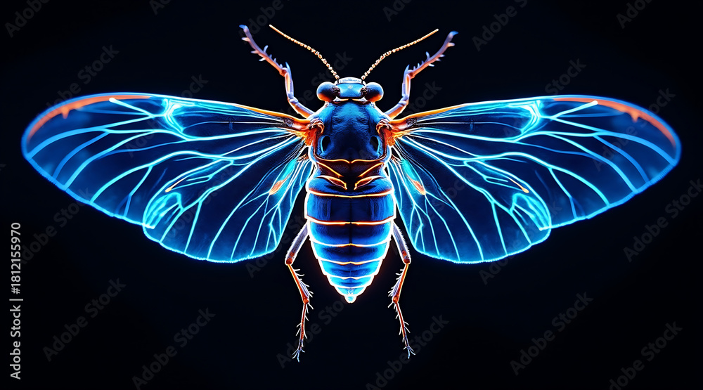 Glowing cicada with transparent blue wings and intricate vein patterns spreads its wings against dark background, showcasing vibrant colors #1812155970