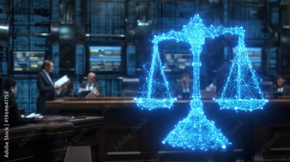 Glowing 3D holographic scales of justice made of blue data streams in a sharp, detailed cyberpunk courtroom with metallic walls, digital monitors, and lawyers in focus. #1969641753