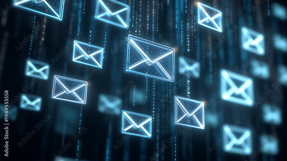 Glowing digital envelopes on a dark background. #1949533558