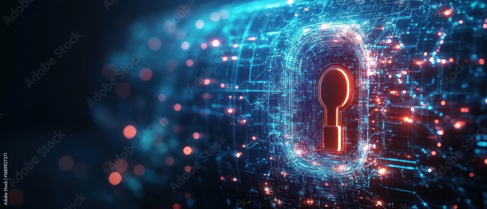 Glowing digital keyhole symbol surrounded by shimmering blue and red circuit-like light patterns representing cybersecurity and data protection #1689927371