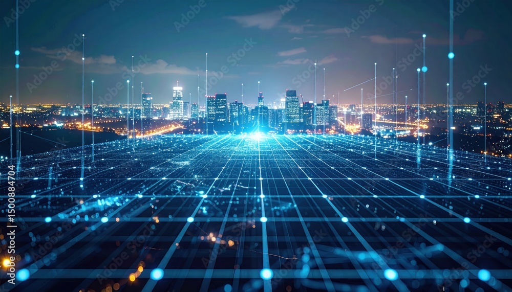 Glowing digital network connects the modern city skyline in the future world. #1500884704