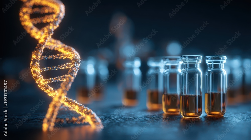 Glowing golden DNA double helix and laboratory vials on dark background, concept of biotechnology and genetic research #1931701497