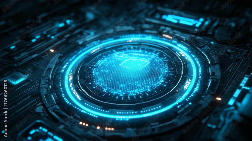 glowing holographic portal with concentric digital rings and neon blue highlights, floating in dark sci-fi environment, high-tech HUD interface elements surrounding circular platform #1766260129