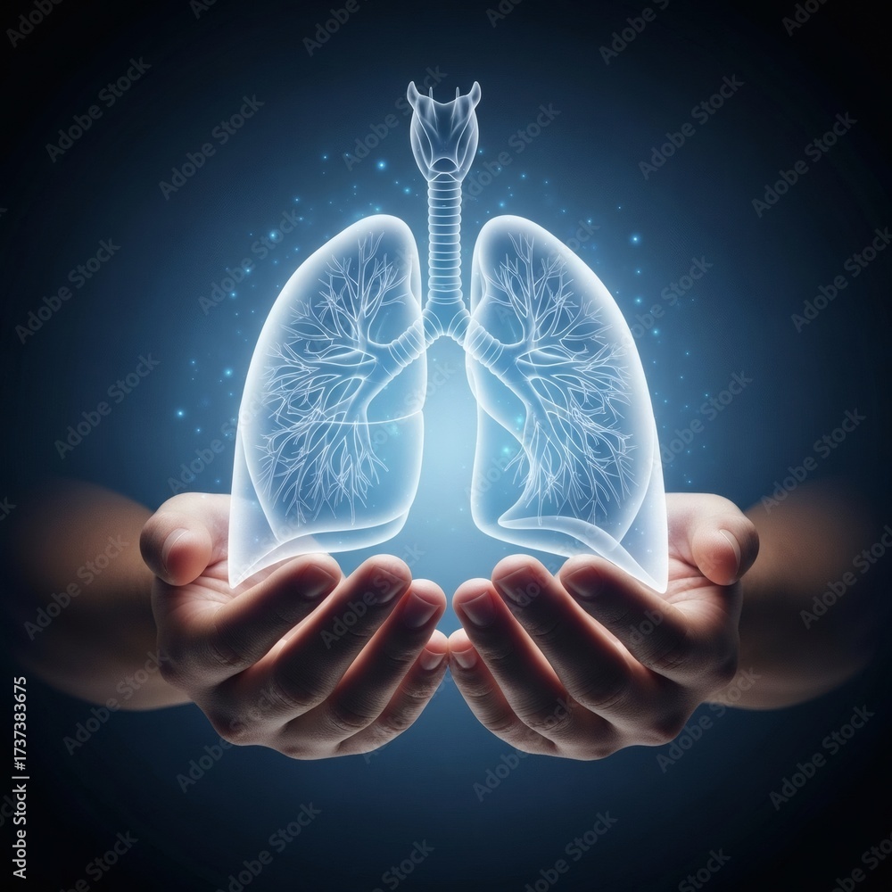 Glowing human lungs held gently in cupped hands with dark background #1737383675