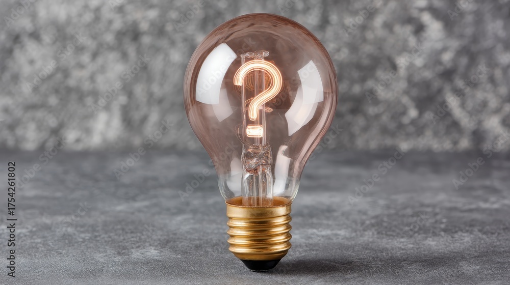 Glowing lightbulb with question mark filament symbolizing curiosity, innovation, and discovery against dark slate background with subtle light flares and copy space #1754261802
