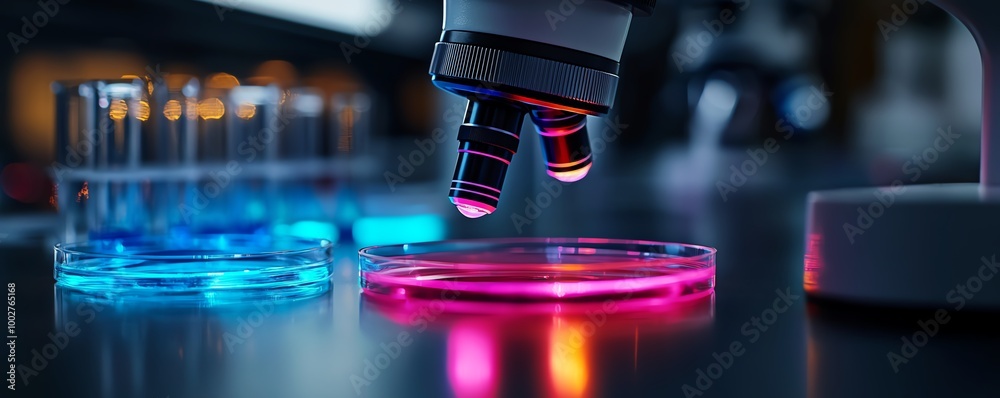 Glowing microscopes and vibrant petri dishes on a sterile lab table, modern bio lab environment, Biological lab, Microscopy #1002765168