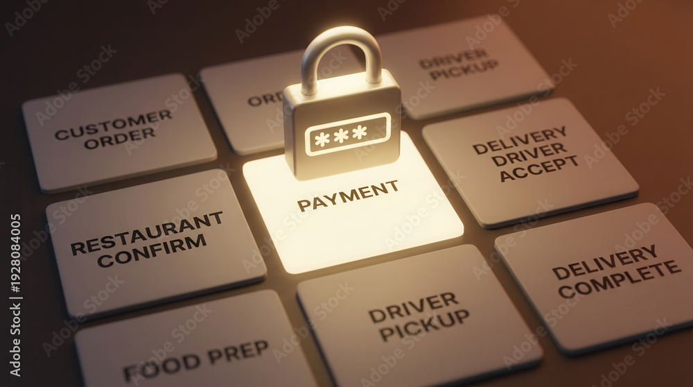 Glowing padlock securing digital payment tile represents safe finance transaction protecting banking data against cyber threat offering peace of mind to consumer #1928084005