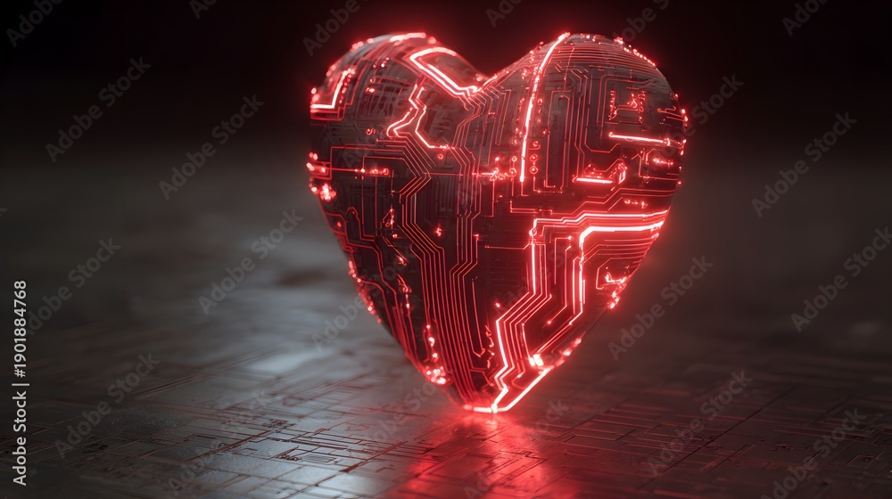 Glowing Red Circuitry Heart - Futuristic Digital Love Concept on Dark Background. #1901884768