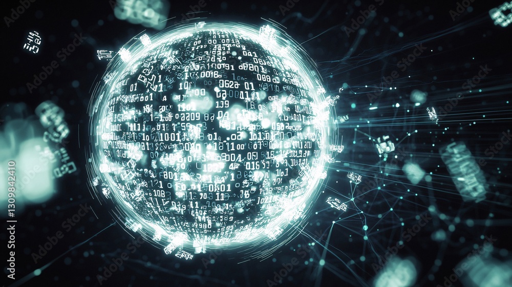 glowing sphere with binary numbers scattered around it, set against a dark background with faint digital patterns, symbolizing the randomness and order of digital data. glowing sphere, binary #1309842410