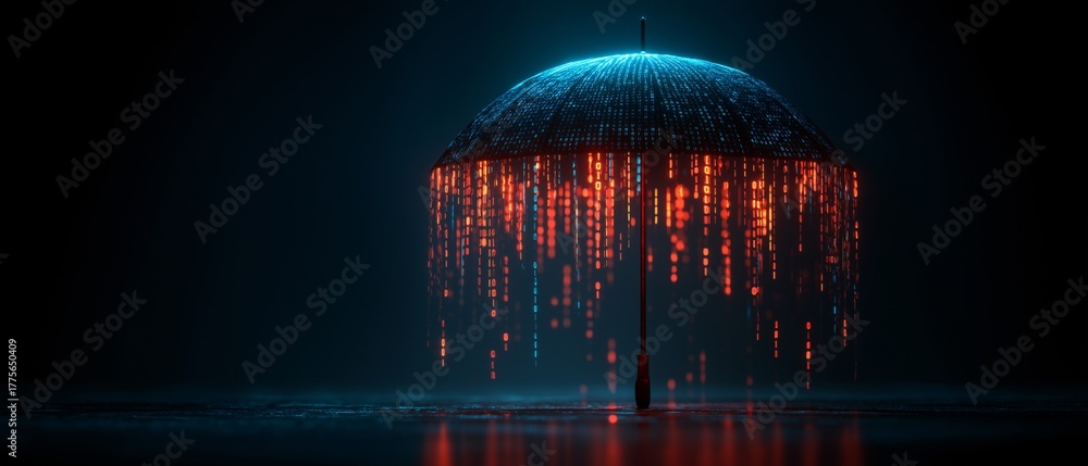 Glowing umbrella shields against digital data storm, with vibrant red and blue lights cascading down in dark, futuristic setting. scene evokes sense of protection and innovation #1775650409