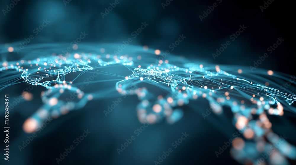 Glowing world map made of lines defocused space nodes, faceless futuristic concept, connected visualization detail, blurred cosmic background, global brand, powerful interface, dat #1782454371
