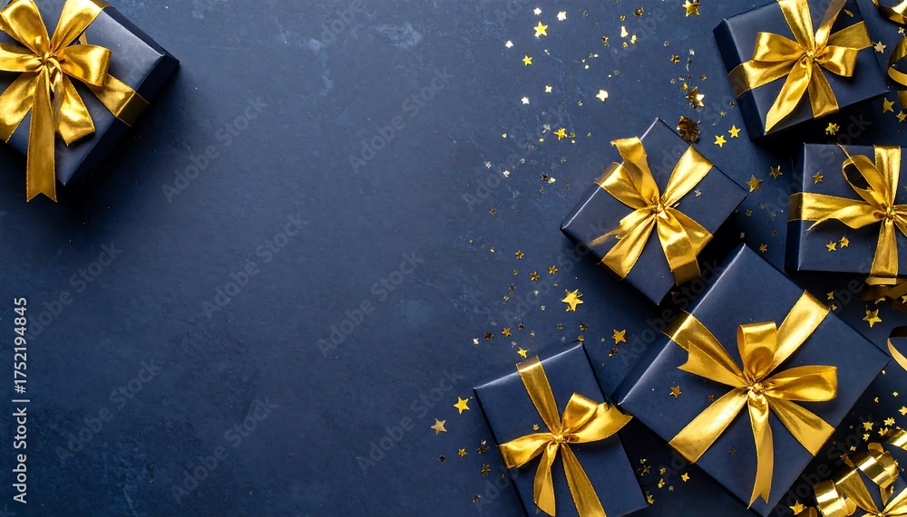 Gold bows, gold stars, present boxes in navy and gold, and a dark blue backdrop #1752194845
