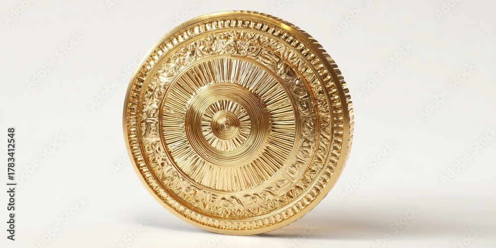 Gold Disk: Intricate golden disk, a relic of the past, its surface adorned with detailed carvings, radiating elegance and historical significance. #1783412548