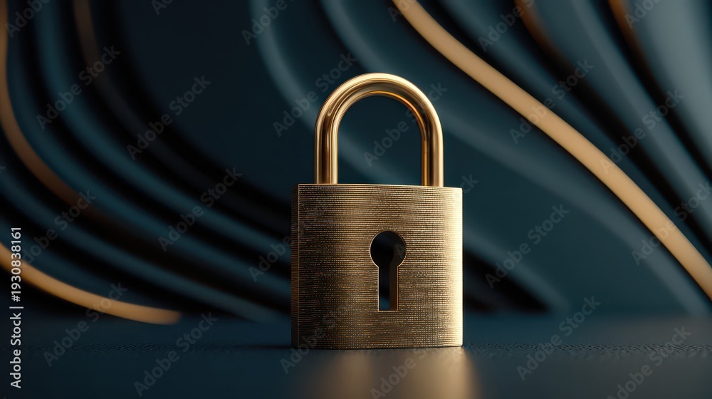 Gold padlock on dark surface with flowing cables creating secure contrast #1930838161