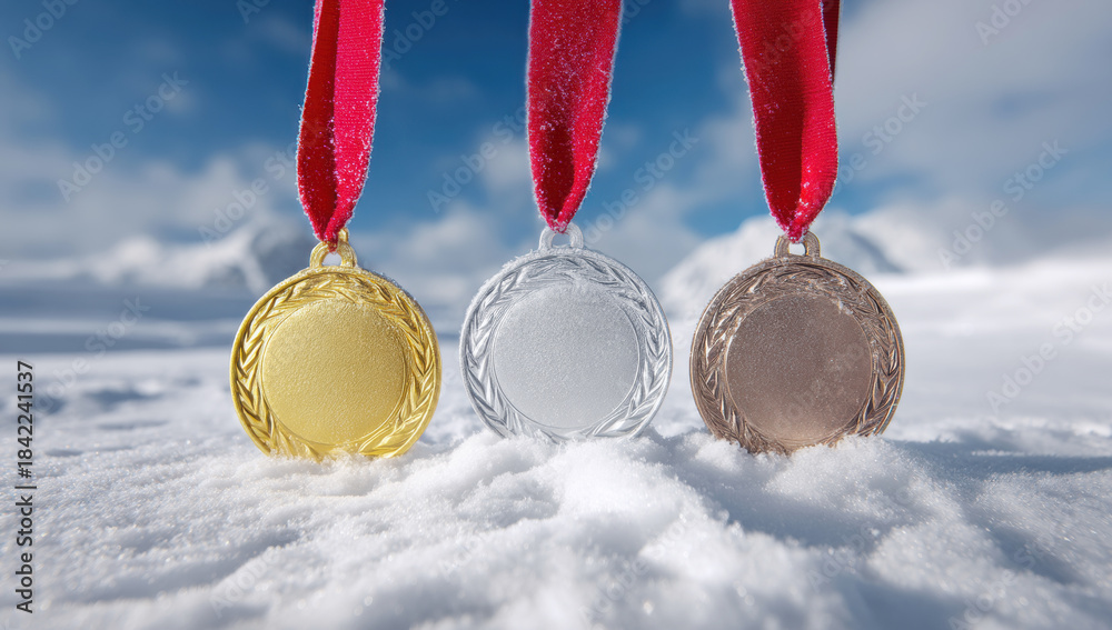 Gold, silver, bronze medals on snow with red ribbons, representing winter sports achievement and victory on a mountain #1842241537