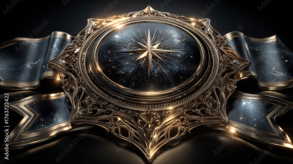 Gold sticker, tag, sale, best price, black friday, discount, new. Round shiny smooth metal emblem. Award, medal oval element with uneven wavy zigzag edge, star shape. Isolated on black background EPS #1763722422