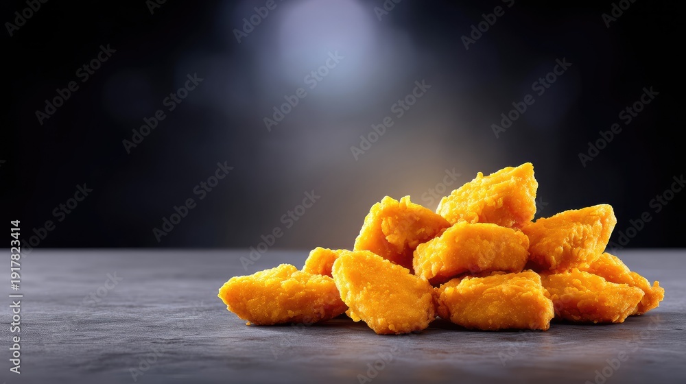 Golden and Crispy Chicken Nuggets Piled on a Dark Surface with Soft Bokeh Background for Delicious Food Photography #1917823414