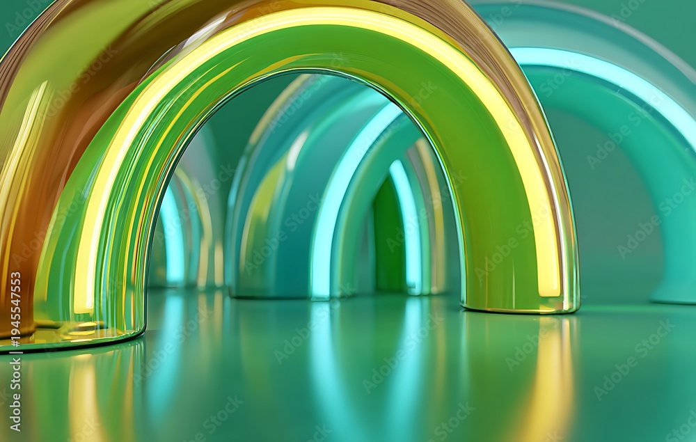 Golden And Teal Arches Reflecting Light In A Futuristic Architectural Space With Smooth Surfaces #1945547553