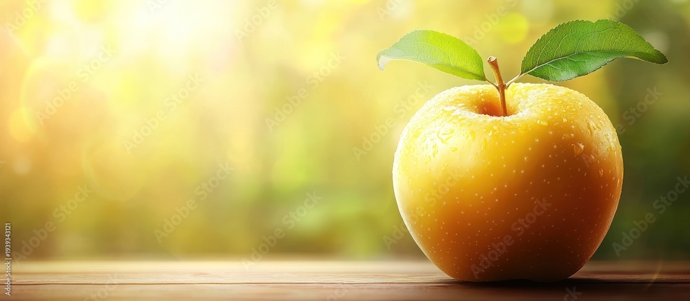Golden apple on wood, sunlit garden backdrop, healthy food #1939343121