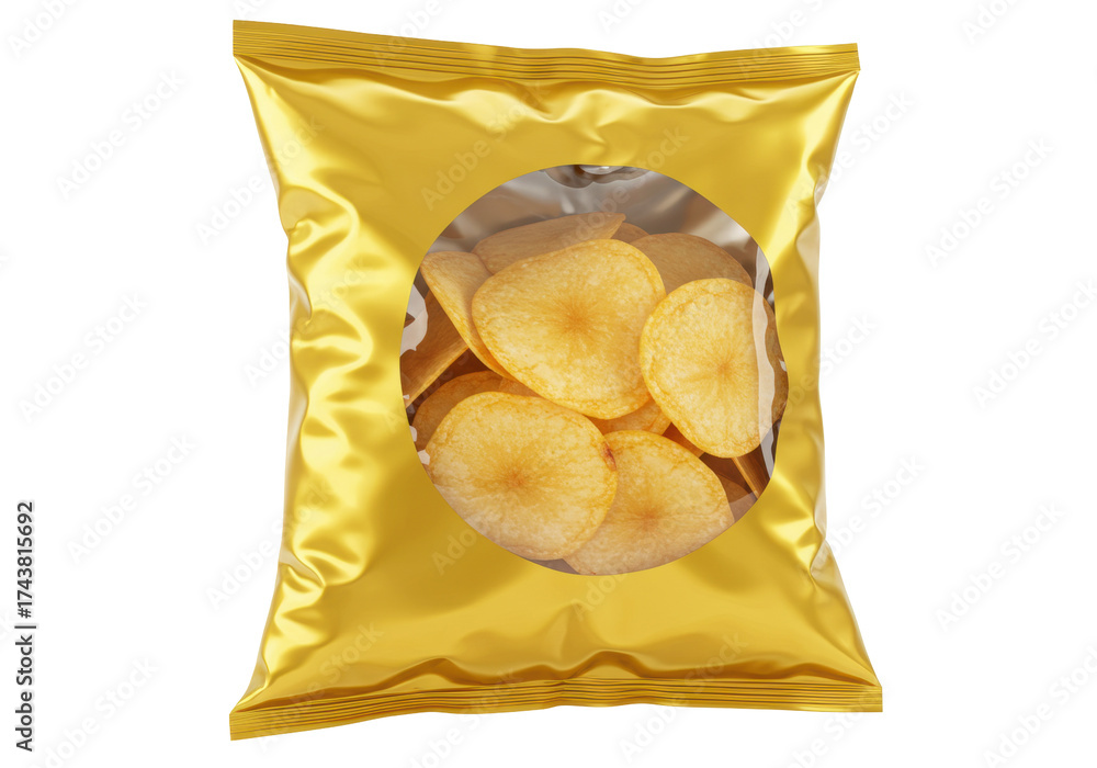 Golden bag of potato chips isolated on transparent background, crispy snack food in PNG format for design and advertising #1743815692