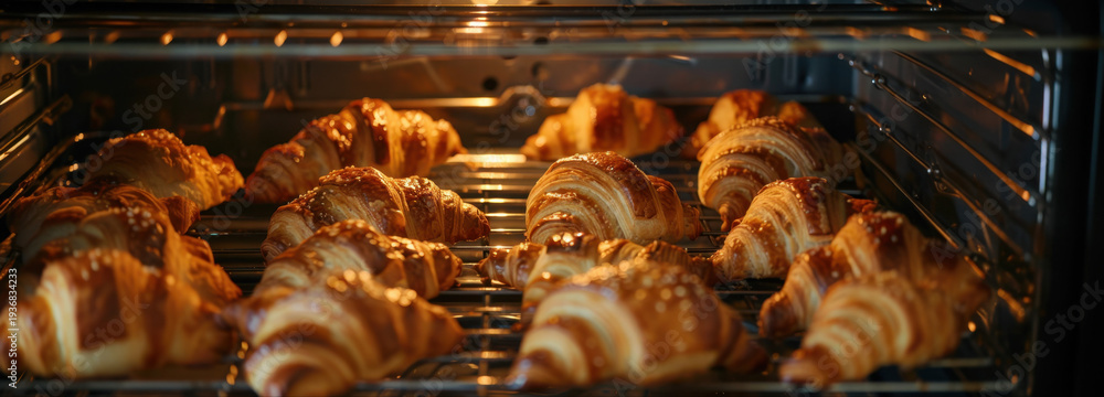 Golden Bakery: A mouthwatering array of freshly baked, golden croissants, nestled inside a warm oven, promising a delightful treat for the senses. #1936834233
