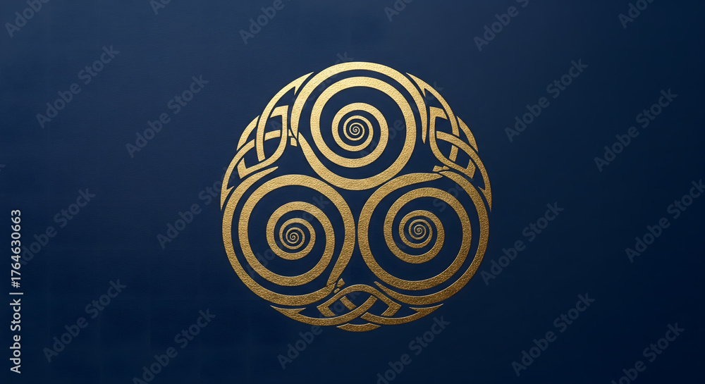 Golden Celtic Triskele on Blue: A Symbol of Interconnectedness and Eternity, Ancient Spirals: Traditional Celtic Symbol Isolated on a Dark Blue Backdrop #1764630663