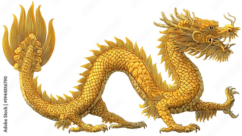 Golden Chinese Dragon Illustration with Fiery Mane and Tail. #1944816790