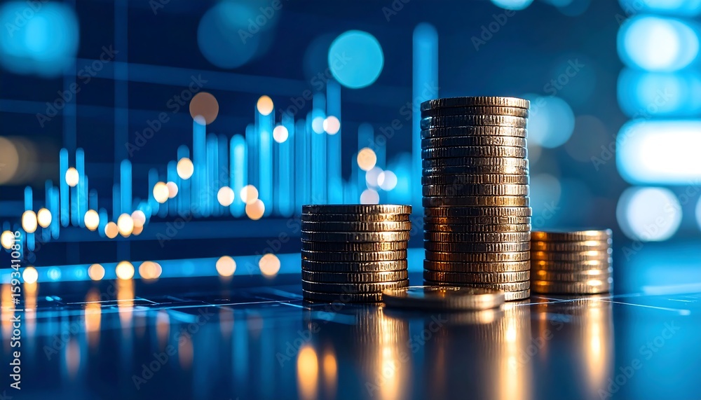 Golden coin stacks on a reflective surface against a glowing blue digital stock market graph. Business finance, investment, and economic growth concept with abstract bokeh background. #1593410816