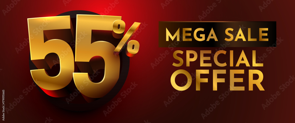 Golden 55 discount special offer with Mega Sale text on a luxurious dark red background. Ideal for promotions and advertising banners. Vector illustration #1790115665