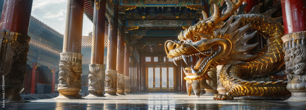 Golden Dragon in the Hall: A majestic golden dragon statue takes center stage in an ornate hall, its intricate details and imposing presence exuding power and history. #1781816499