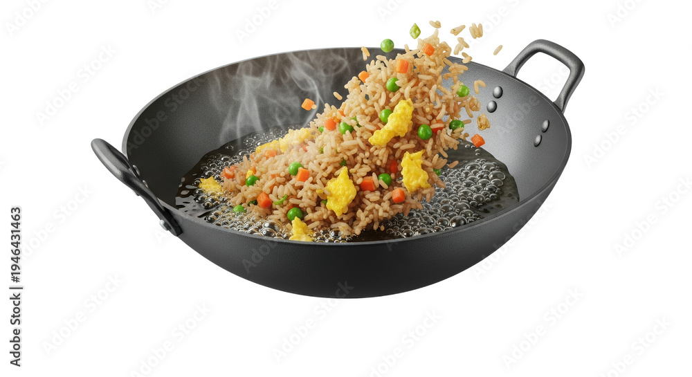 Golden fried rice with vibrant peas, carrots, and egg expertly tossed in a steaming hot wok. #1946431463