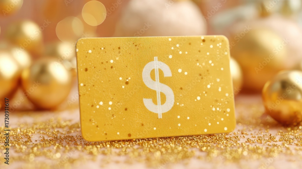Golden gift card displayed on shimmering festive background with decorative elements #1730911617