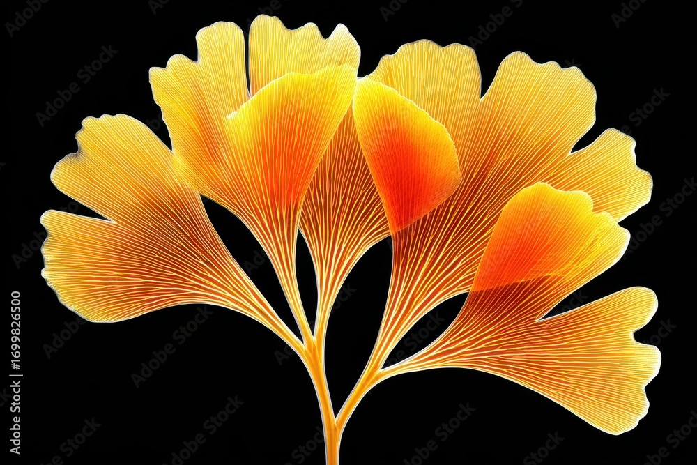 Golden ginkgo leaves illuminated on a dark background highlighting intricate patterns #1699826500