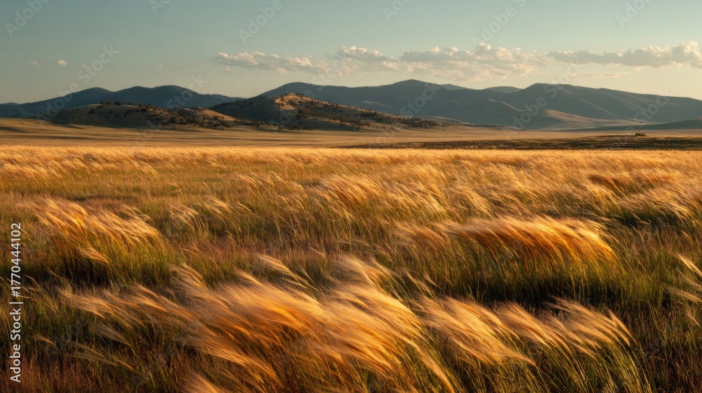 Golden Grass Landscape with Gentle Breeze, Rolling Hills, and Soft Clouds Under Bright Sky at Sunset in Natural Outdoor Setting #1770444102