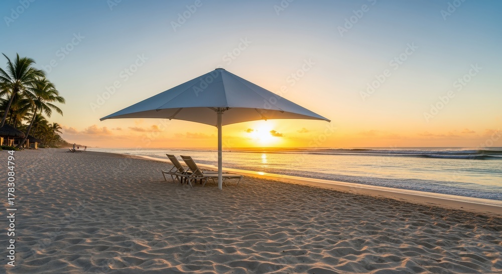 Golden Hour Beach Escape: An inviting beach scene, captured at the golden hour with an umbrella shading lounge chairs, perfect for a tranquil getaway. The calm ocean reflects the sunrise. #1783084794