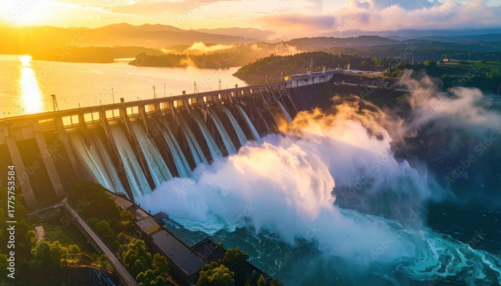 Golden hour sunlight reflects on powerful hydroelectric dam with massive water flow symbolizing renewable energy strength and sustainability in modern era #1775753584