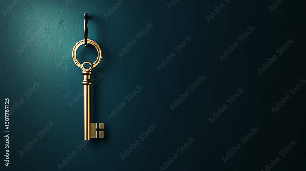 Golden key hangs on a teal wall, showcasing simple elegance and leaving ample free space for text or logo, symbolizing opportunity, access, and potential #1307787125