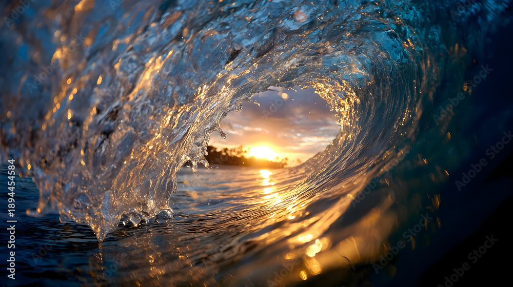 Golden light illuminates inside a perfect ocean wave barrel at sunset #1894454584