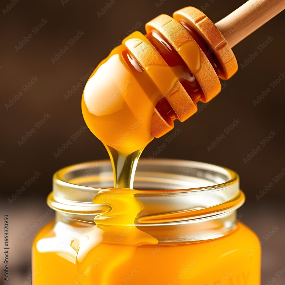 Golden liquid honey flows lusciously from a wooden dipper onto a jar, evoking natural sweetness and purity for healthy eating. #1954370950