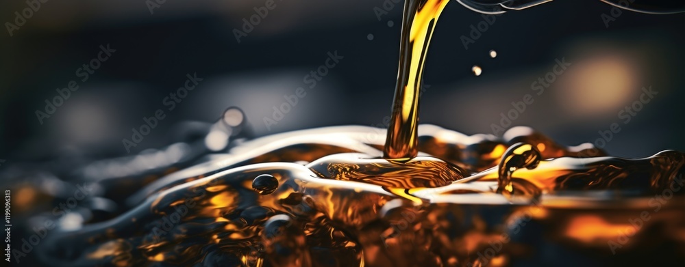 Golden motor oil is being poured into a car engine. The mechanical components are partially visible in the background, illuminated by warm lighting, creating an industrial yet focused environment #1199096313