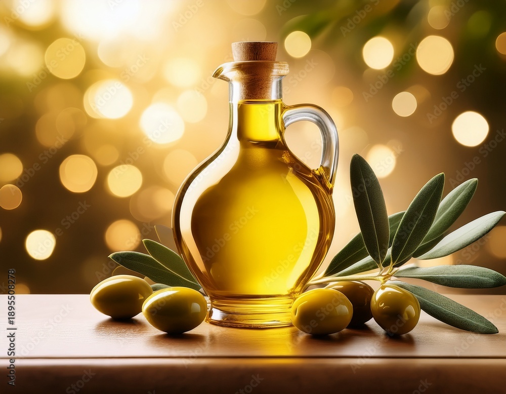 golden olive oil bottle with green leaves and olives against a soft background with sparkles #1895508278