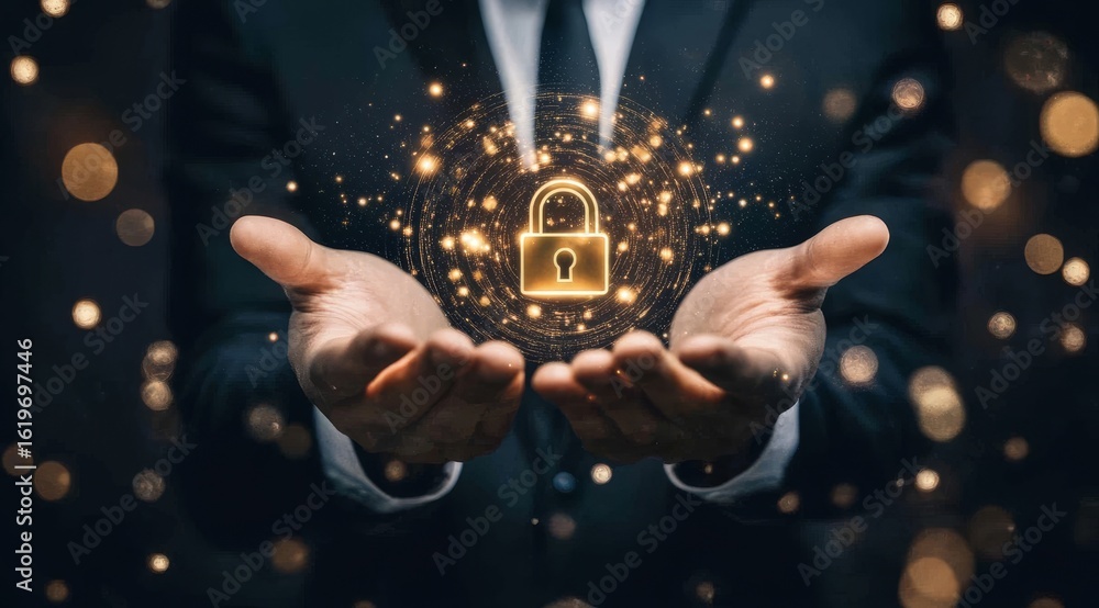 Golden Padlock in Hands Digital Art, Abstract Concept, Security, Data Protection, Cybersecurity Cybersecurity, Digital Security #1619697446